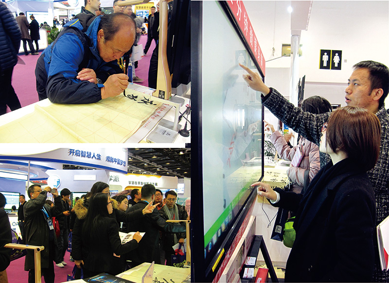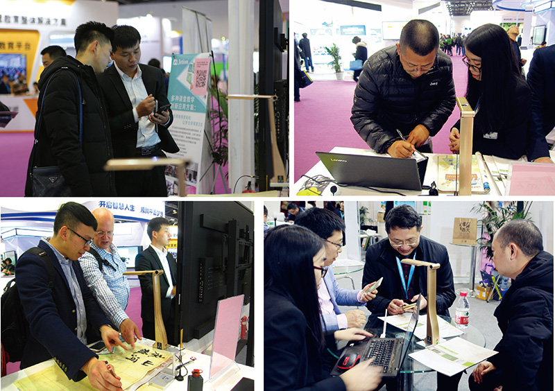 有的被吉星無線視頻展臺的微課應用演示所吸引,或自己試用演示;有的忍不住在書法演示臺前留下墨寶,或駐足于吉星無線微錄儀各學科應用宣傳屏幕前,詢問或洽談;有的拿著宣傳資料詳細閱讀,或掃碼,或一邊與吉星銷售經理們互動……就這樣,第二天不到,吉星近千份宣傳冊已被一搶而空,而銷售經理們都無一例外地嘶啞了嗓子。