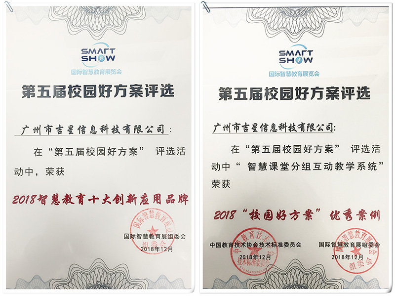 吉星信息科技在教育設(shè)備領(lǐng)域的深耕細(xì)作以及對(duì)教育行業(yè)用戶(hù)的大量成功服務(wù)經(jīng)驗(yàn),被“國(guó)際智慧教育展組委會(huì)”授予“2018智慧教育十大創(chuàng)新應(yīng)用品牌”。