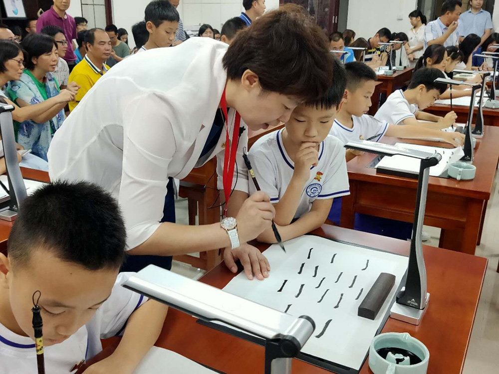 課堂上,姚丹校長通過吉星的書法系統(tǒng),即時的展示自己的書寫過程,一筆一劃讓臺上臺下一目了然。對于書寫中的細節(jié),老師邊寫邊逐步分析。