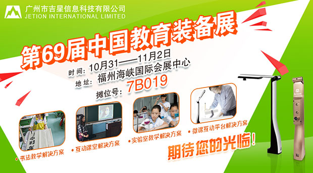 第69屆中國教育裝備展示會將于2015年10月31日-11月2日在福州市海峽國際會展中心隆重舉行,將攜帶“展示互動課堂”、“展示互動書法教學(xué)”、“展示互動實驗教學(xué)”、“微課互動平臺”基于無線視頻展臺的四大教學(xué)解決方案全新亮相。吉星展位號:7B019號,誠邀各位蒞臨吉星展位參觀指導(dǎo)!