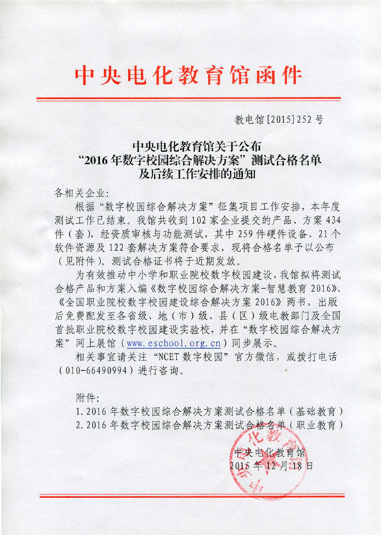 2015年12月24日,吉星無線視頻展和二合一視頻展臺等多款硬件設備和一個教學創新方案“吉星無線翻轉課堂解決方案”在眾多送測產品和方案中脫穎而出,成功通過了中央電教館2016年“數字校園綜合解決方案”檢測并將獲得證書,可參加各地區相關“數字校園解決方案”招標項目。