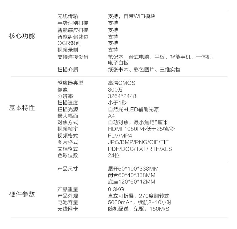 核心功能 無(wú)線傳輸、手勢(shì)識(shí)別掃描、智能感應(yīng)掃描、智能糾偏裁邊、OCR識(shí)別、視頻錄制等