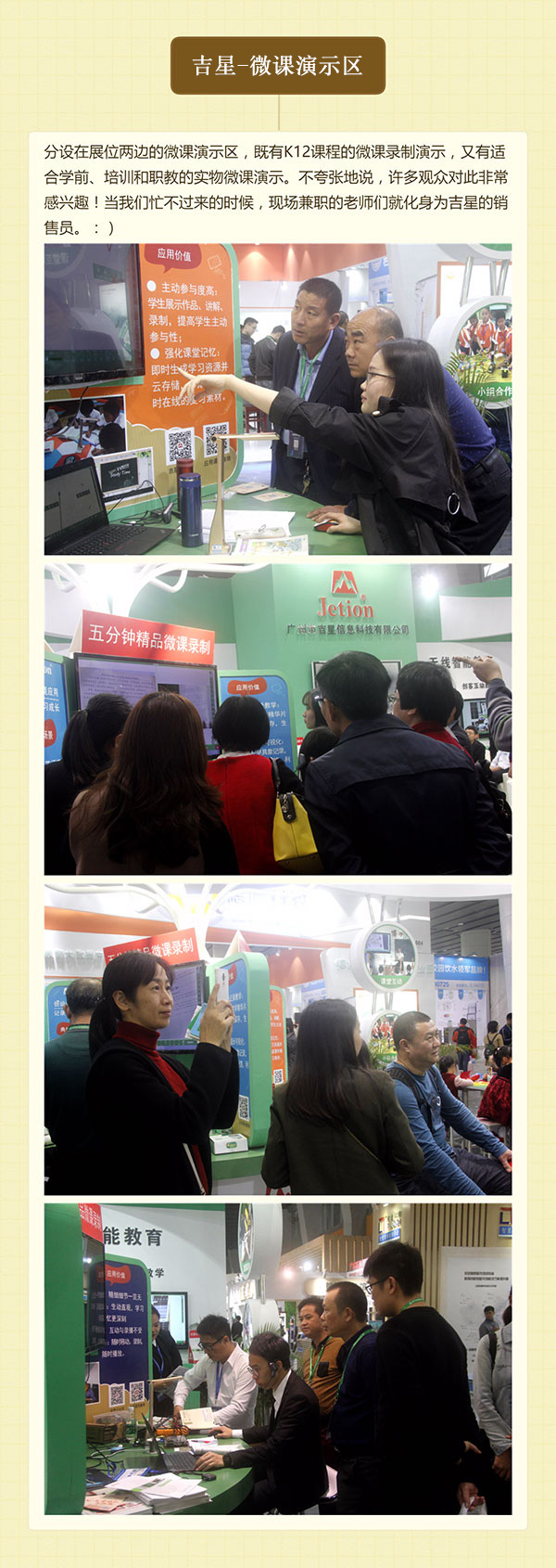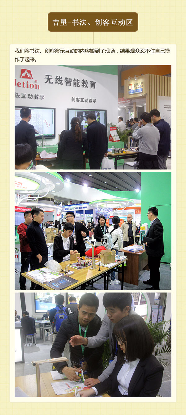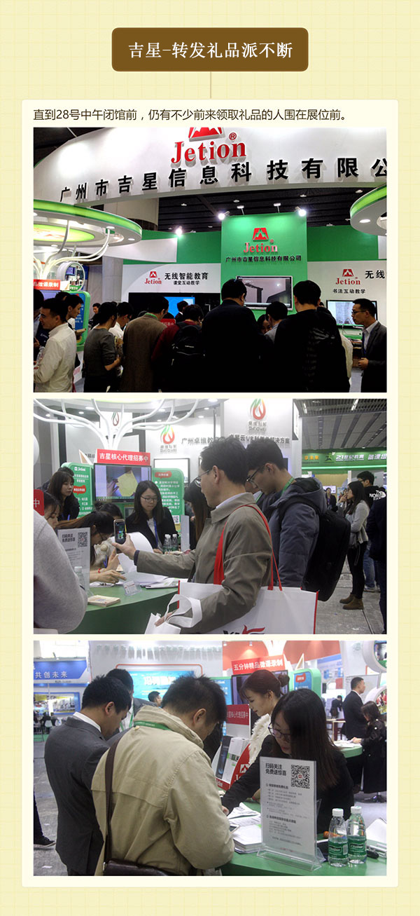 從26號9點開展,到28號中午11:30閉展,期間,在5.1館A005展位的吉星,帶著無線視頻展臺/無線微錄儀、各種學科的課堂互動應用方案、神秘的全新升級產品、免費派送的各式禮包,忙碌著和前來參觀指導的新老朋友們愉快相見。
